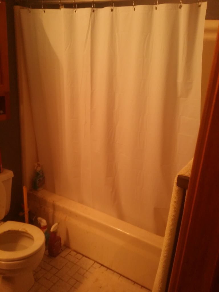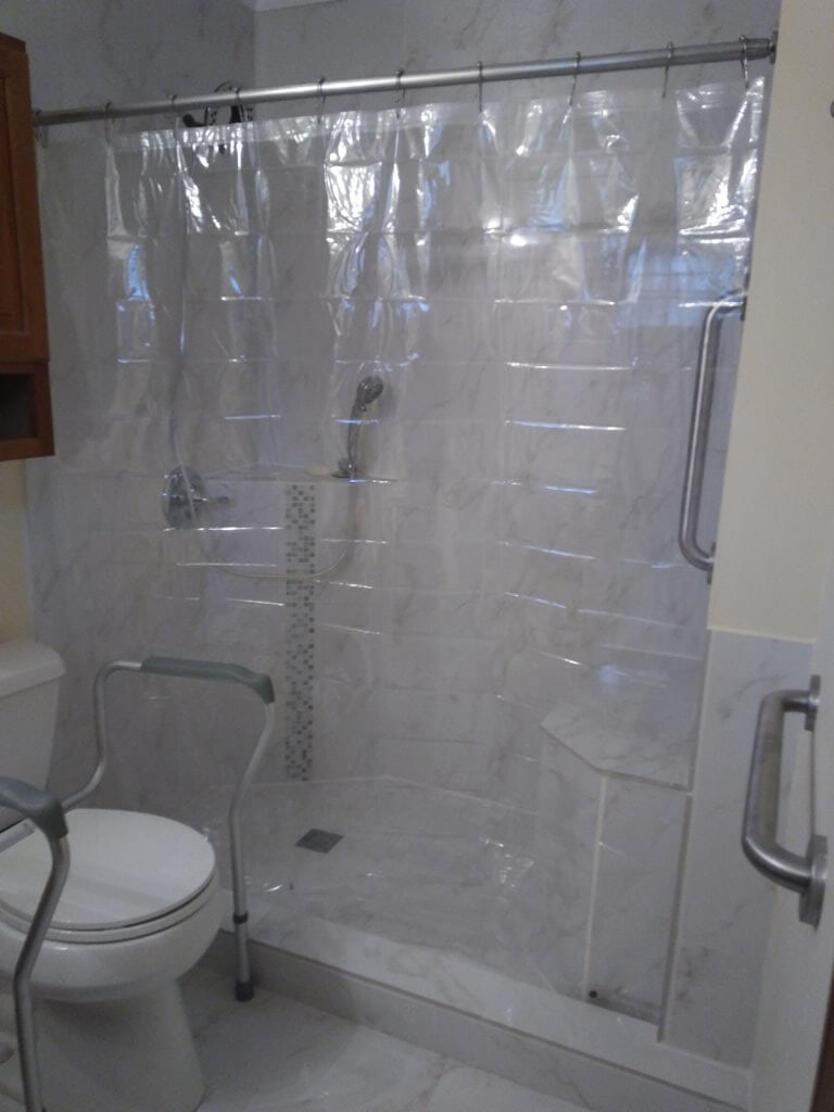 The clear shower curtain is easier for her to get in and out of with their small space