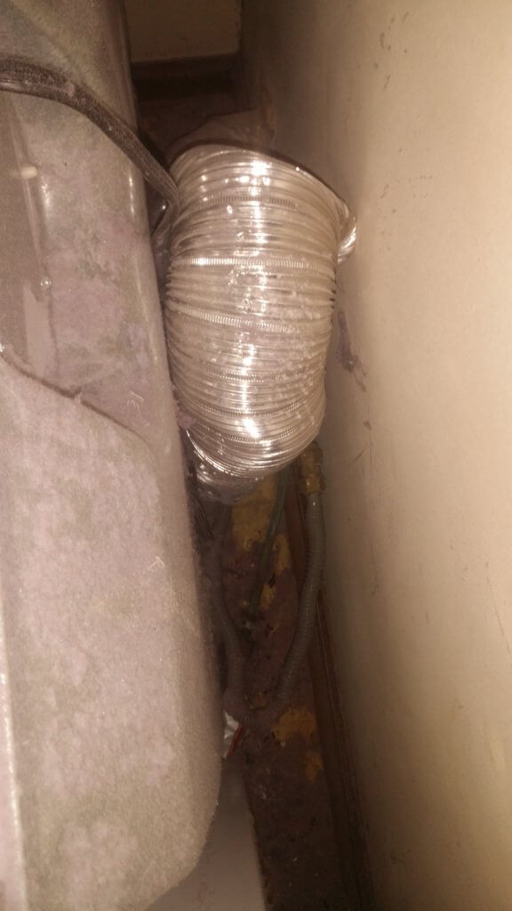Dryer duct blowing lint into crawlspace next to kinked copper gas line!